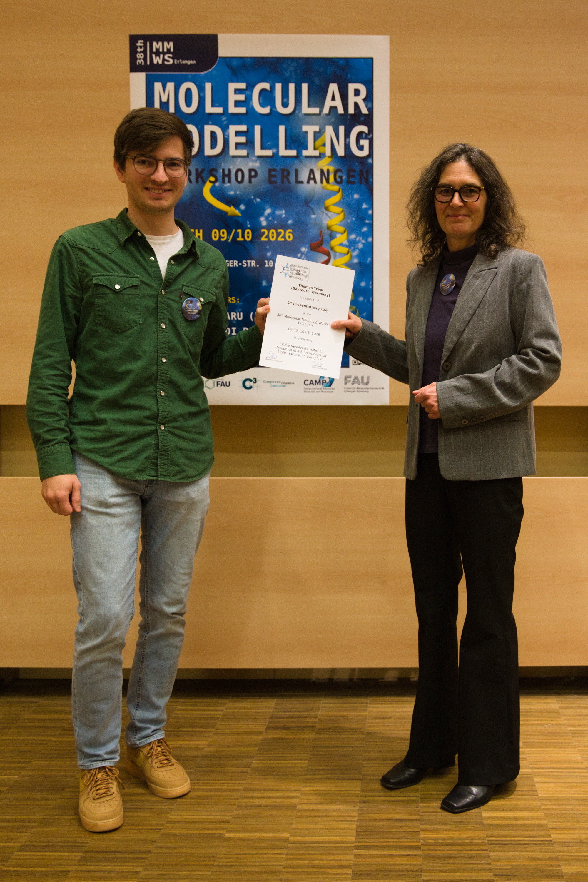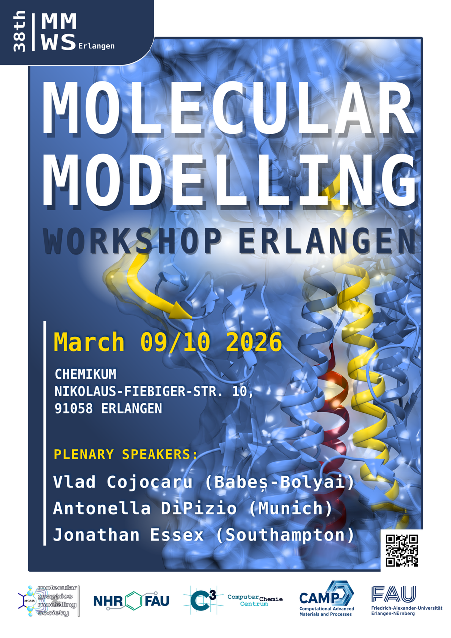 The 38th Molecular Modeling Workshop 2026 is scheduled to take place in Erlangen on March 9th and 10th 2026 and offers an ideal platform for researchers, postdocs, and PhD students to showcase their findings to the molecular modeling community. This event enables young scientists to connect with peers from academia and industry, discuss their research, and receive valuable input from experienced researchers. Presentations of early-stage and ongoing research projects are highly encouraged.
